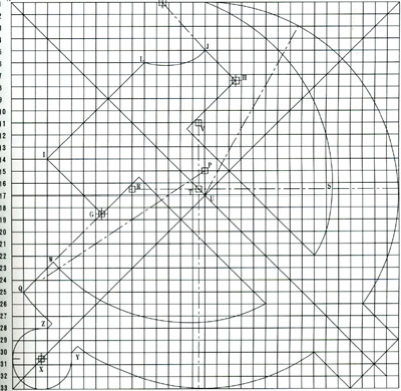 3 鐮刀的畫法:以M點(17、17′)為圓心、MN(N點為17、1′)為半徑畫弧⌒NO(O點為17、33′);以P點(17、15′)為圓心、PO為半徑畫弧,與HG的延長線交于Q點;以R點(1116′、17′中點)為圓心、RN為半徑畫弧,與通過R點的水平線交于S點;以T點(16、1716′、17′的中點)為圓心、TS為半徑畫弧,與通過T點的垂直線交于U點;以V點(16、1711′中點)為圓心、VU為半徑畫弧,與HG的延長線交于W,構(gòu)成鐮刀。以X點(3、430′、31′的中點)為圓心作圓與AB、BC線相切,從Y點(6、30′)、Z點(4、28′)分別作直線平行于BD,構(gòu)成鐮刀把。